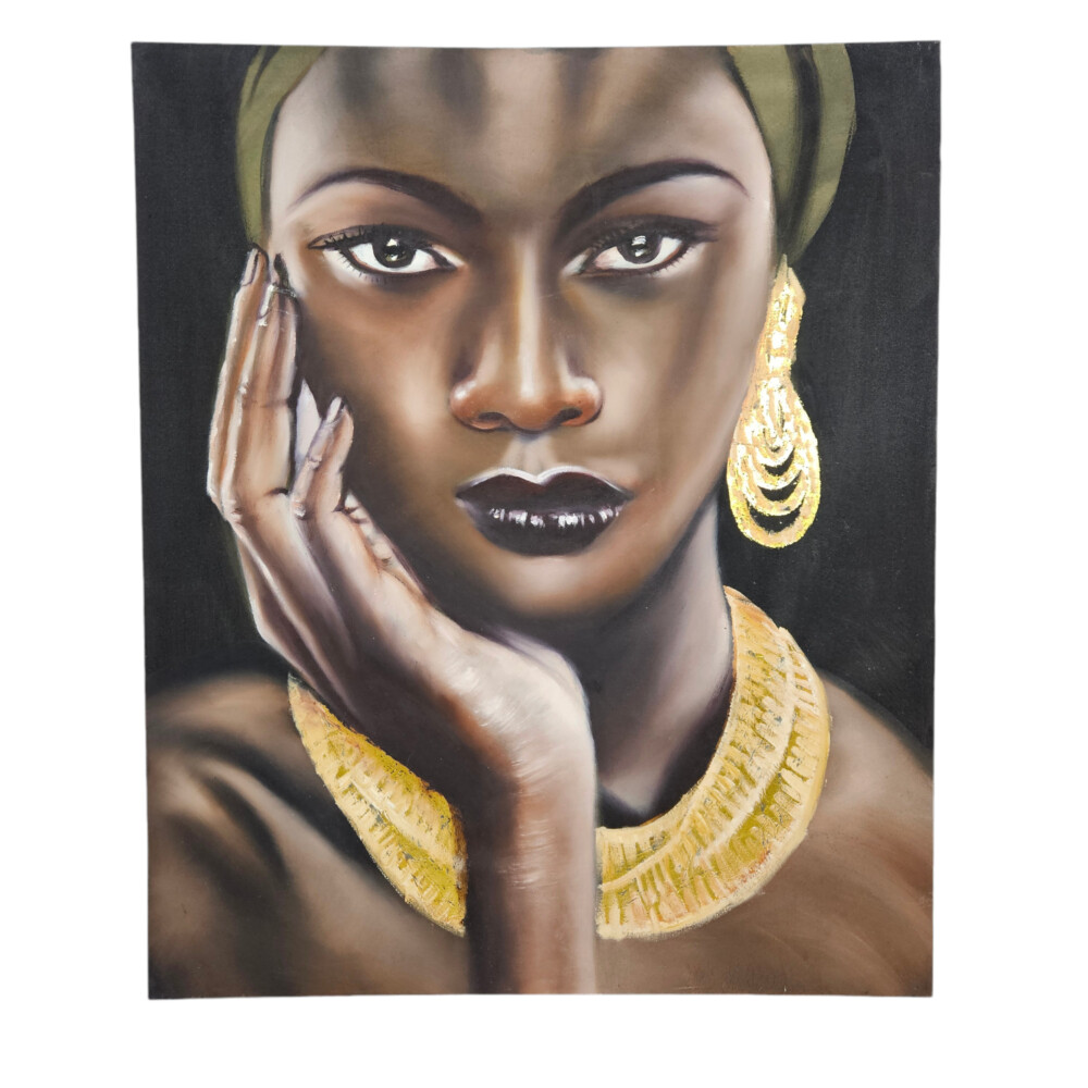 Introducing the Golden African Beauty Oil Painting, a striking 100cm (L) x 120cm (H) artwork that captures the elegance and grace of African heritage