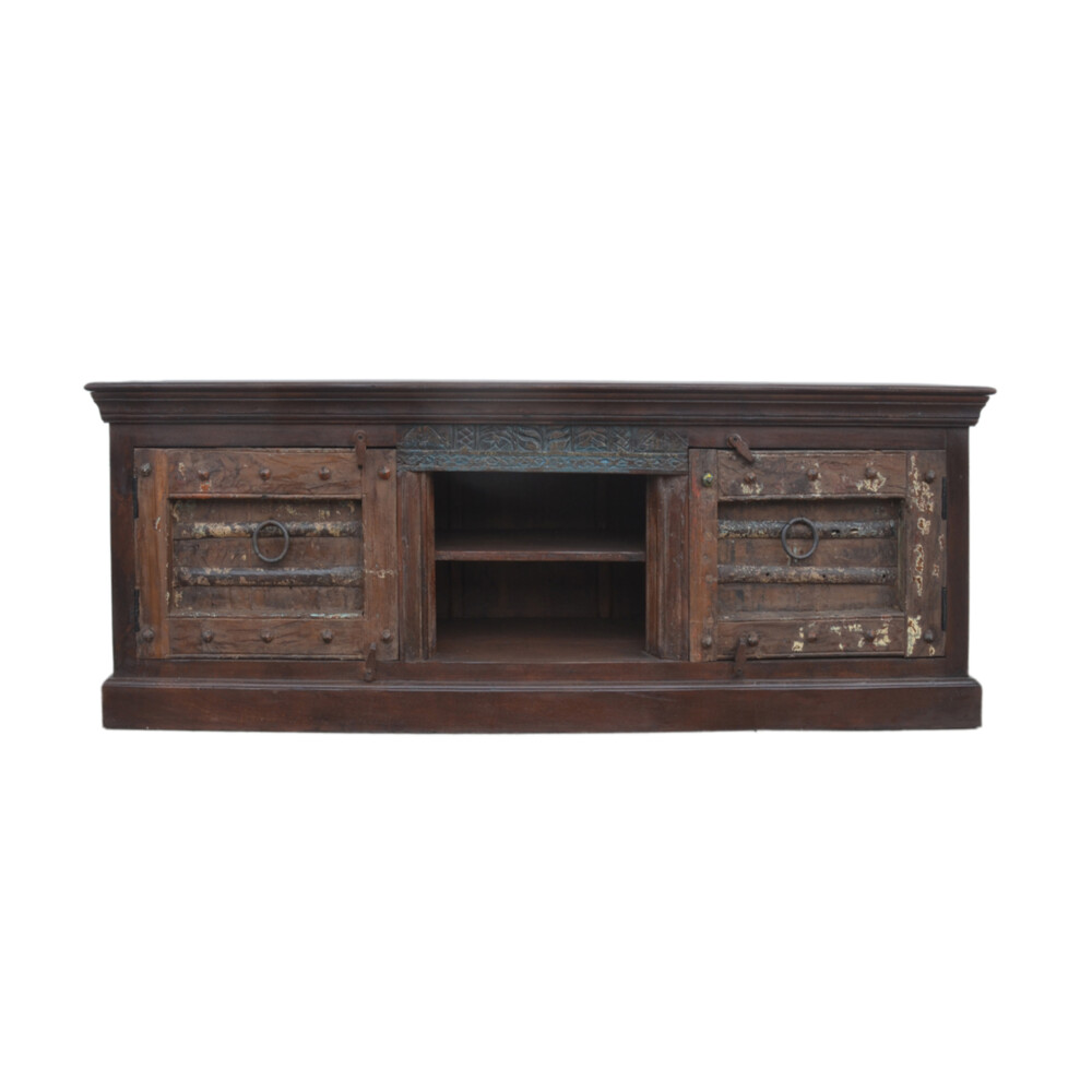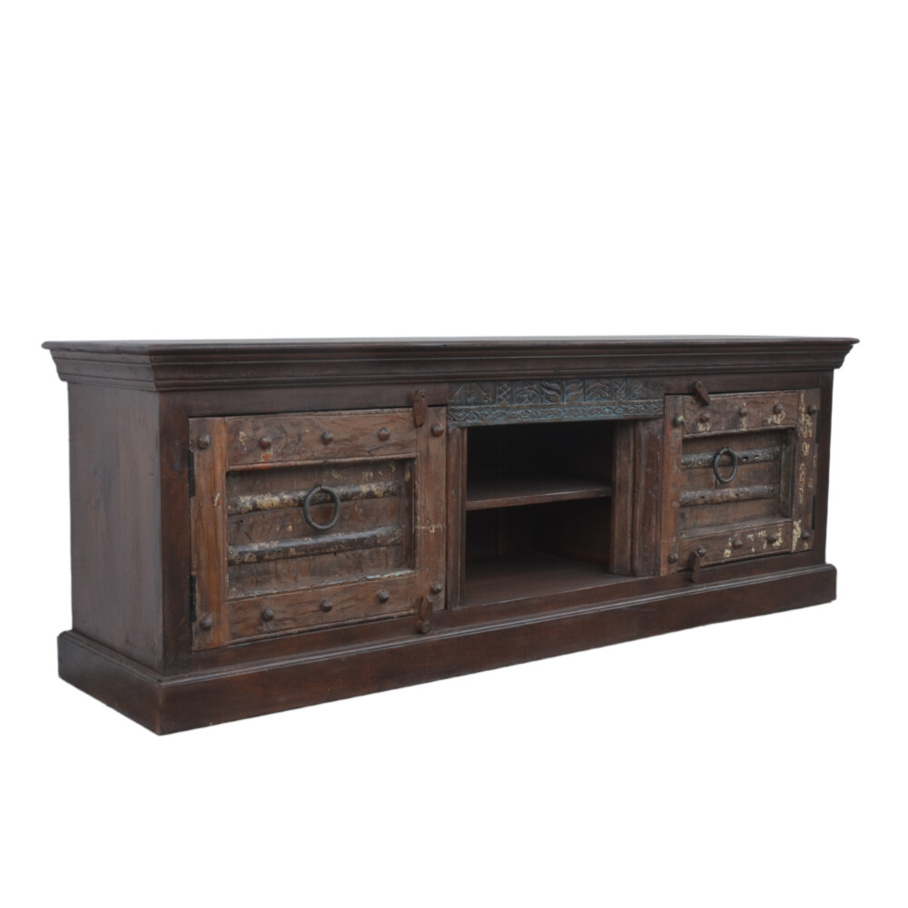 Crafted from solid mango wood, this 183 cm wide, 43 cm deep, and 58 cm high unit offers a unique aesthetic with its weathered finish and repurposed antique-style doors, each featuring hand-carved details and iron ring handles