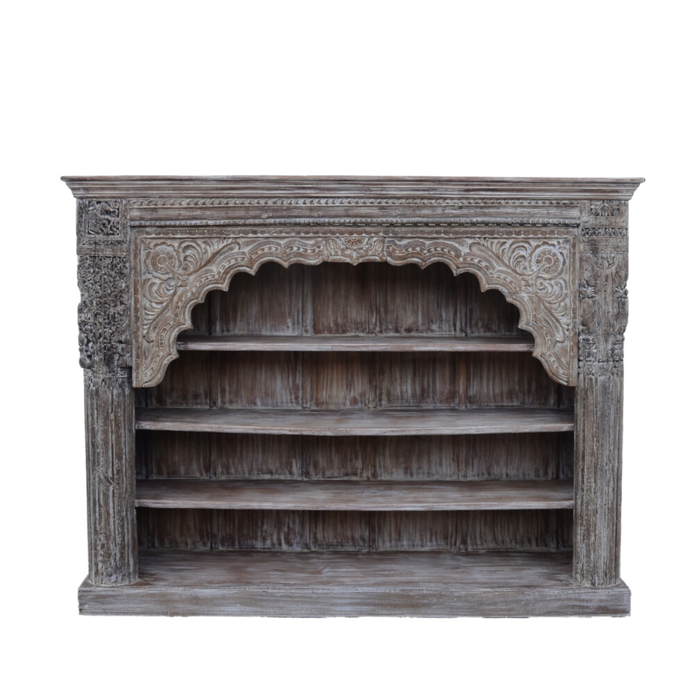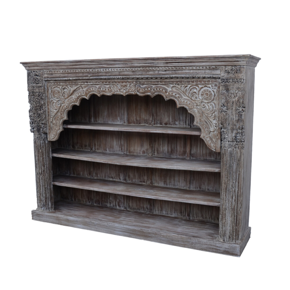 The hand-carved arch detailing draws inspiration from classic architectural designs, featuring intricate floral patterns and ornate pillar carvings that give this piece an old-world charm.