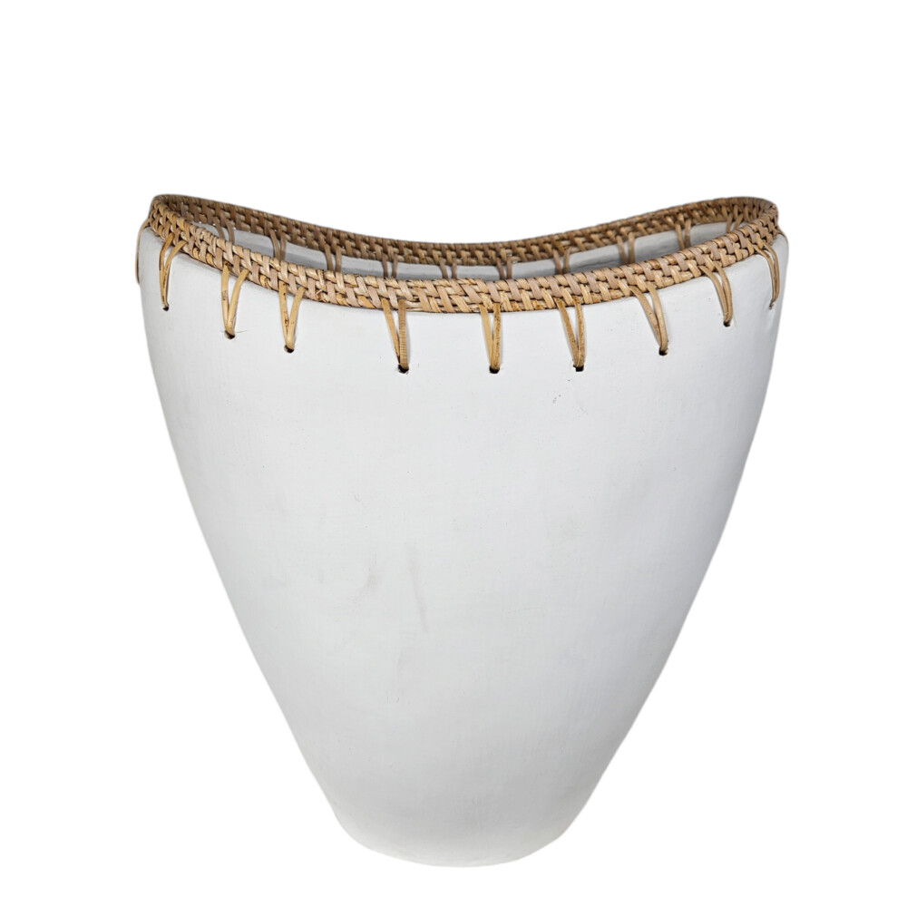 Measuring 28cm (L) x 18cm (W) x 30cm (H), this vase features a smooth terra body with a gently curved shape, while the top is adorned with intricately woven rattan, adding a touch of rustic charm