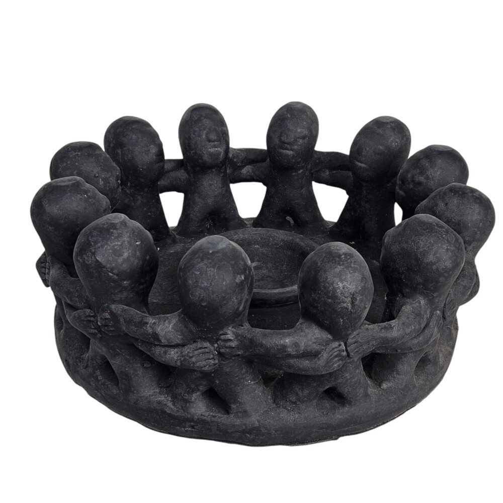 Crafted from durable terra, this unique piece features twelve figures holding hands in a symbolic circle around a central candle holder.