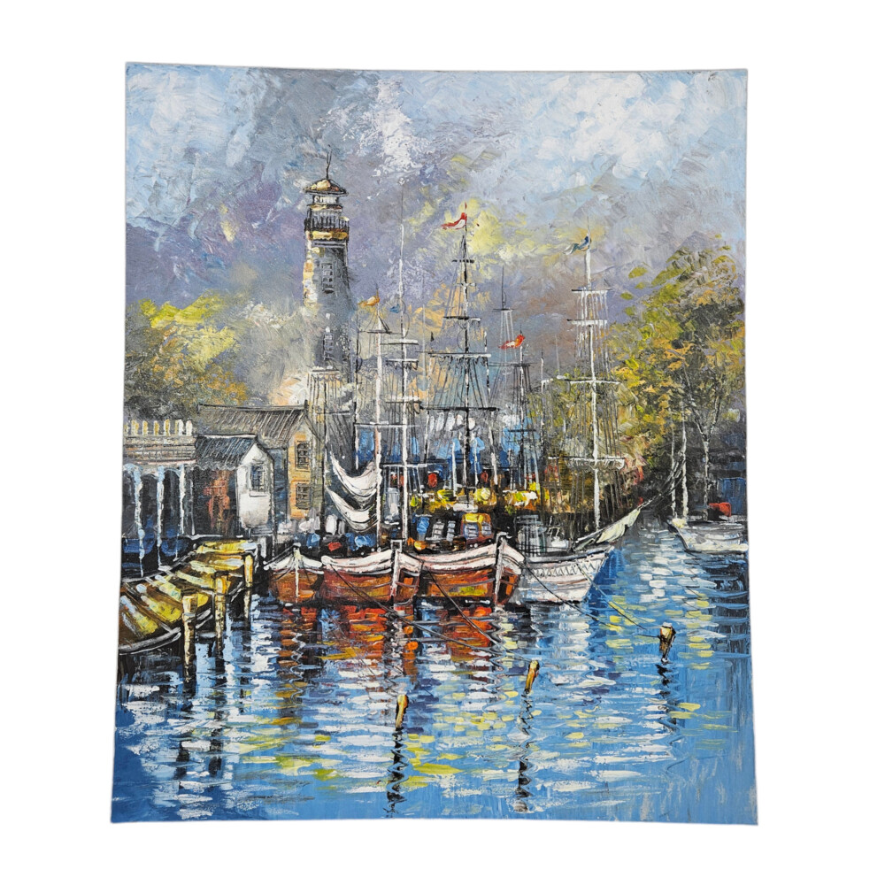 Measuring 100cm (L) x 120cm (H), this artwork brings to life a serene canal lined with boats, highlighted by intricate details of masts, reflections in the water, and a distant lighthouse