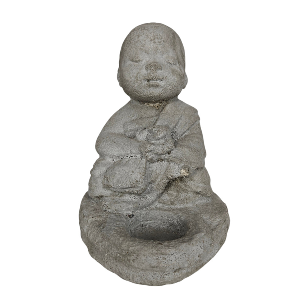 The monk holds a small bowl designed to fit a tea light candle, softly illuminating the surrounding space with a warm, gentle glow. With its minimalist design and natural cement finish, this candle holder adds a touch of tranquility and simplicity to any decor setting, fostering relaxation and mindfulness