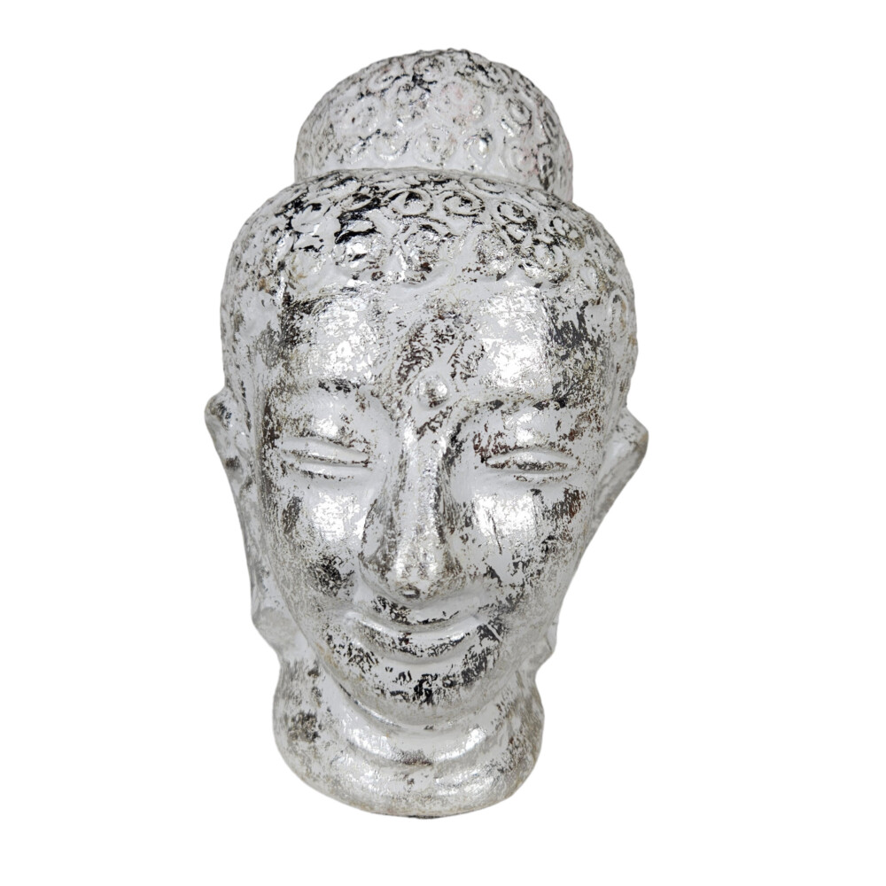 Expertly crafted with a silver metallic wash finish, this serene Buddha head statue adds a touch of tranquility and elegance to any setting
