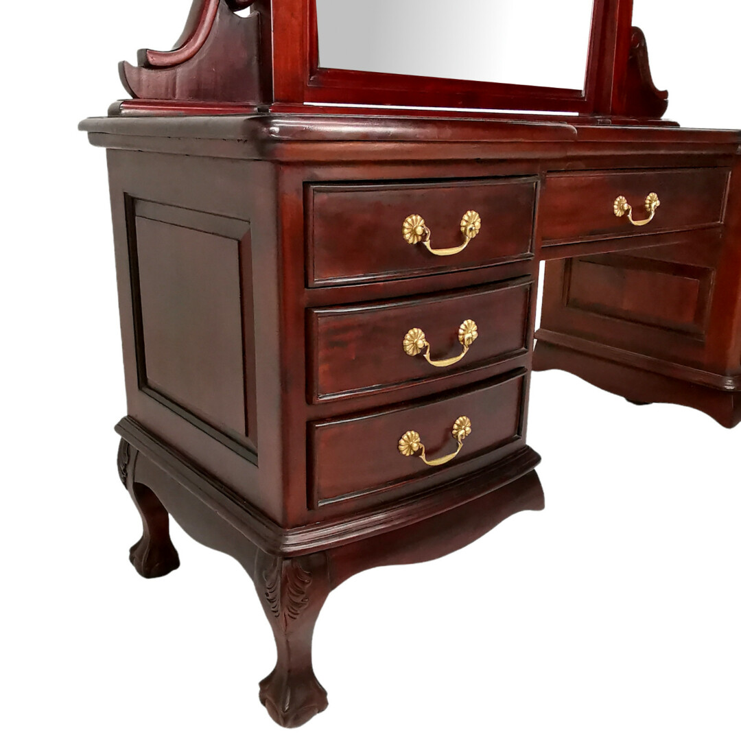 Crafted from solid mahogany with meticulous handcrafting, the Chippendale Dressing Table showcases deep reddish-brown hues complemented by a satin semi-gloss finish that only grows more sophisticated with time.