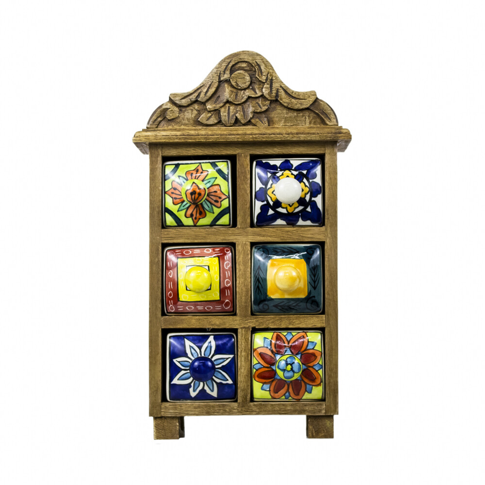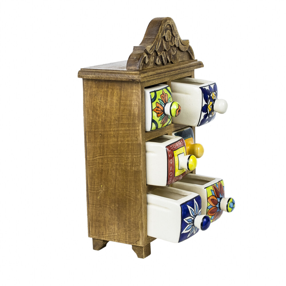 Crafted with precision and care, this exquisite Spice Drawer Box features hand-painted ceramic drawers snugly nestled into a sturdy wooden frame.