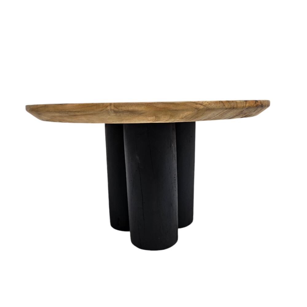 Measuring 35 x 30 cm, this table features a beautifully smooth round top, supported by three robust round log legs, each showcasing the natural grain and warmth of sustainably sourced teak.