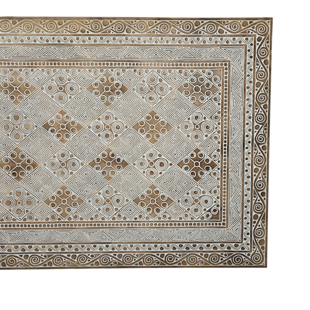 Measuring 220cm (L) x 120cm (H), this piece is a true masterpiece of craftsmanship, featuring a detailed diamond pattern surrounded by ornate carvings that highlight its timeless elegance