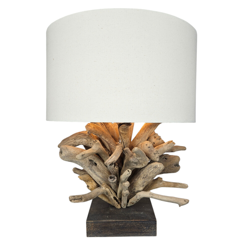 Each piece of driftwood is uniquely shaped, creating a one-of-a-kind base that celebrates raw, coastal-inspired style. Topped with a classic white lampshade, this lamp combines rustic charm with a clean, modern touch