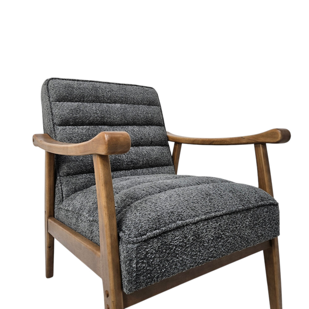 The rich grey polyester fabric upholstery provides a soft, inviting texture, featuring horizontal channel stitching for a refined aesthetic