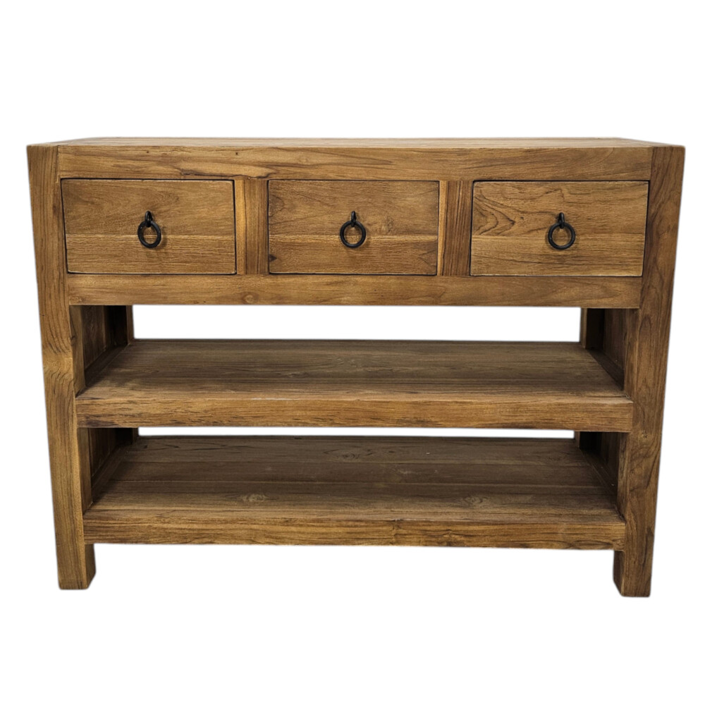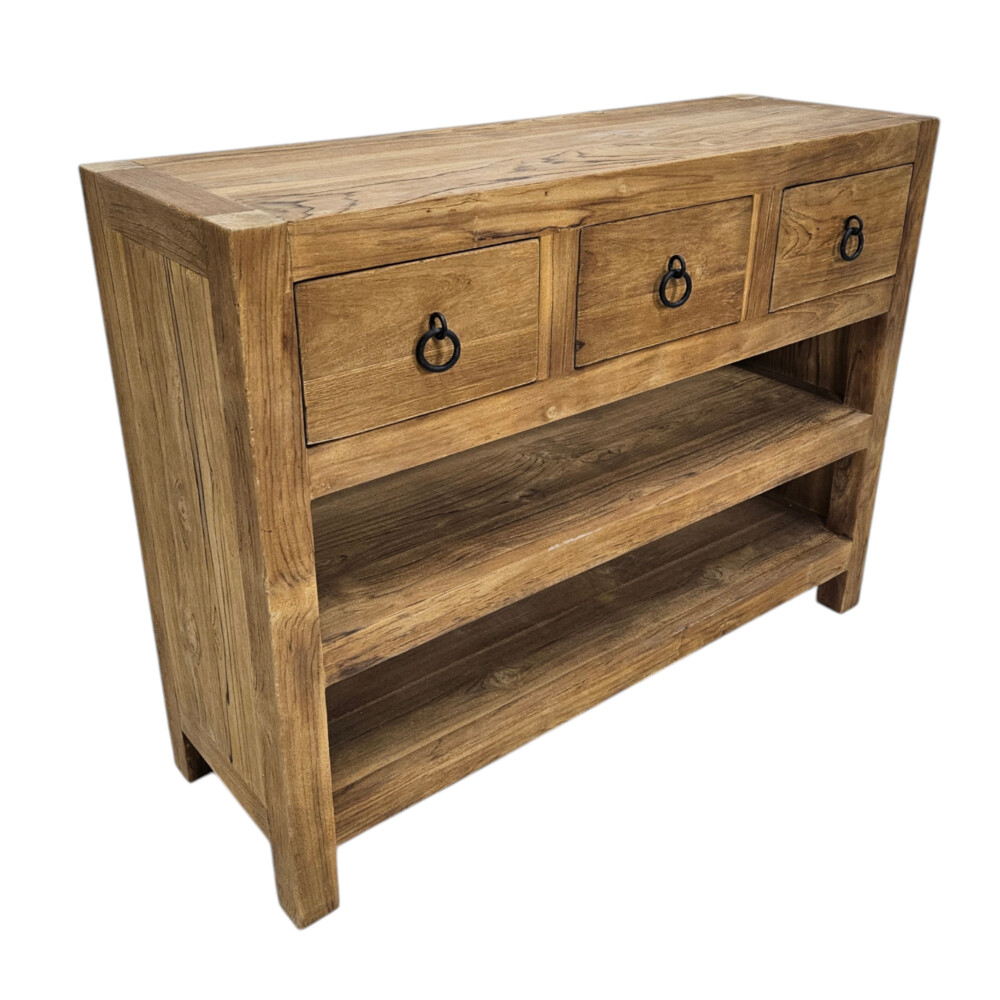 The black metal ring handles add a subtle industrial touch, blending seamlessly with rustic, modern, or farmhouse-style interiors. Whether used in an entryway, living room, or dining area, the Harvest Teak Console Table combines durability, practicality, and refined elegance