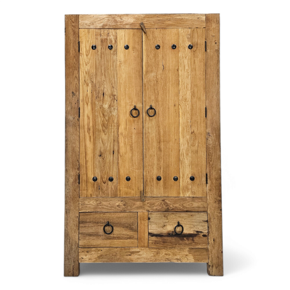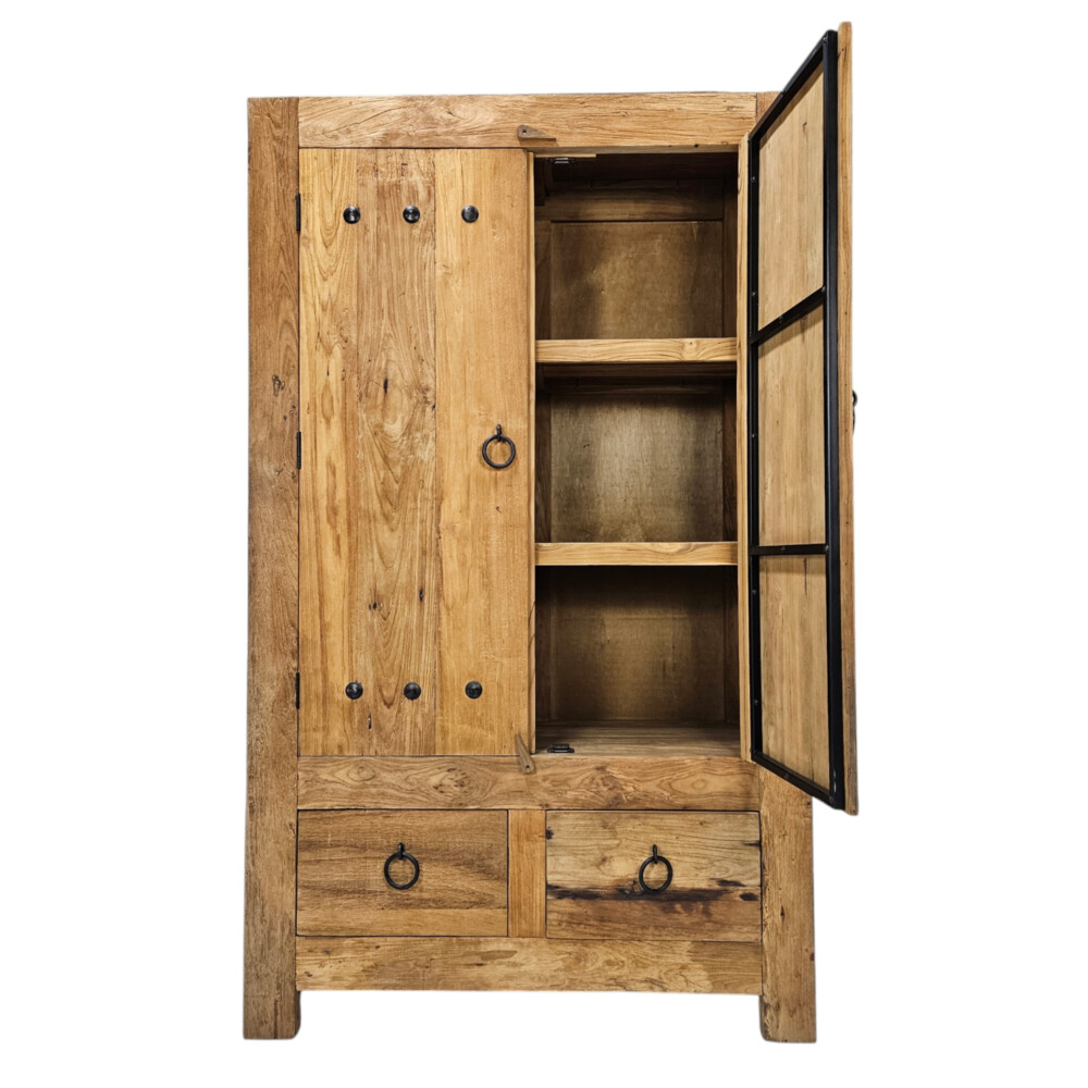 The double doors feature handcrafted black iron details and ring handles, adding a vintage touch that complements the natural wood grain. Inside, multiple shelves provide ample space for organizing essentials, while two lower drawers offer additional concealed storage