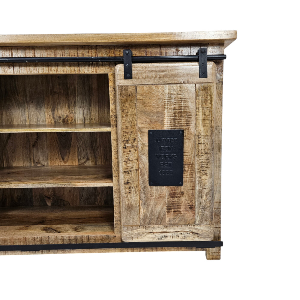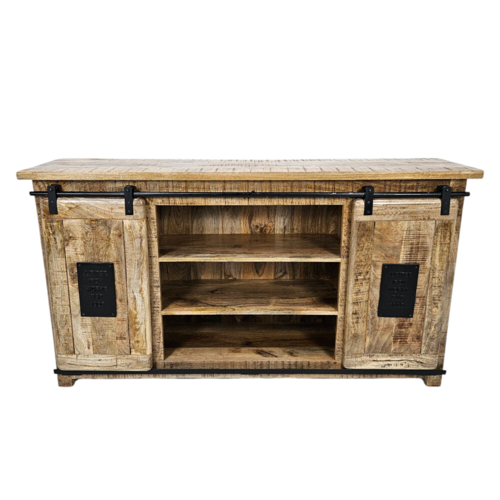 The Industrial Wooden Hayloft Sideboard is a stunning piece of rustic furniture that showcases the beauty of eco-friendly mango wood.