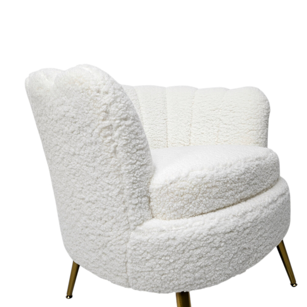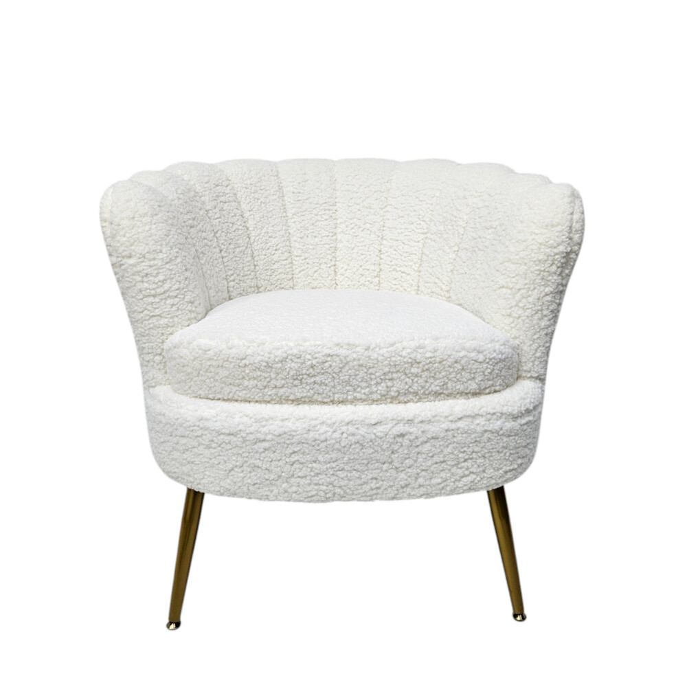 Upholstered in plush polyester fabric, its soft ivory hue creates an inviting and timeless aesthetic. The scalloped backrest design enhances its refined look, offering both visual appeal and ergonomic support