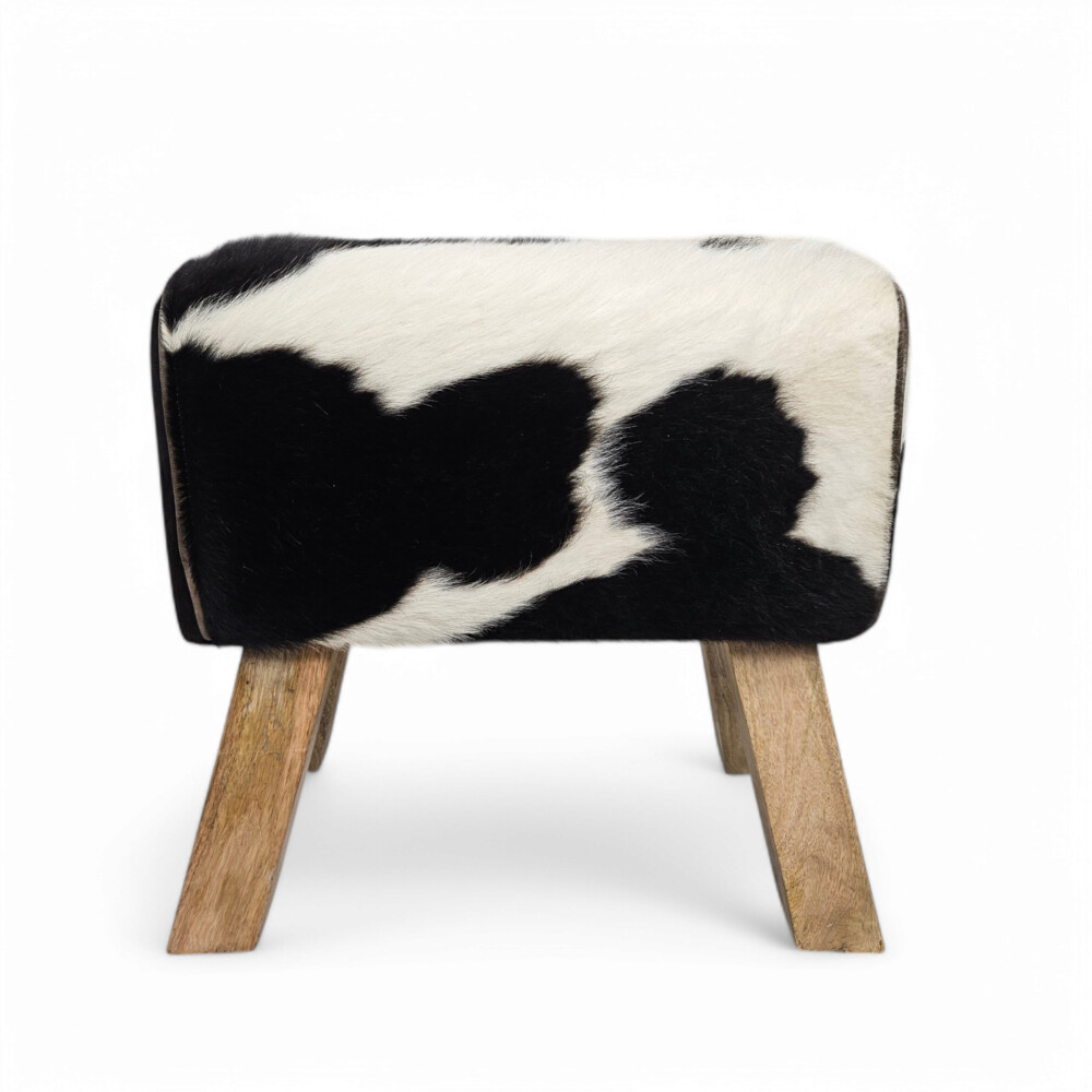 Add a touch of natural charm to your space with the Jasper Hide Stool. Featuring a genuine cowhide upholstered seat, each piece is unique with its own distinctive black-and-white pattern