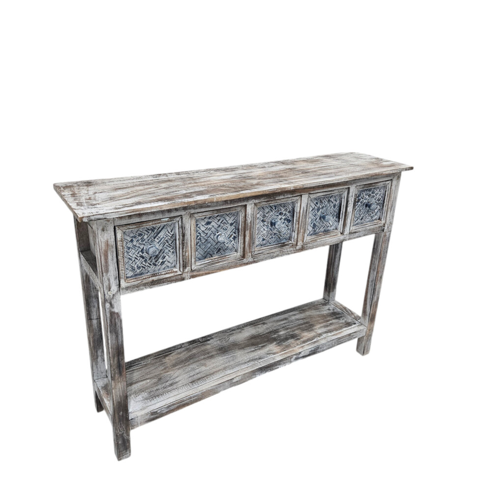The table’s standout feature is its four small drawers, each adorned with a subtle blue wash that adds a touch of color without overwhelming its rustic appeal