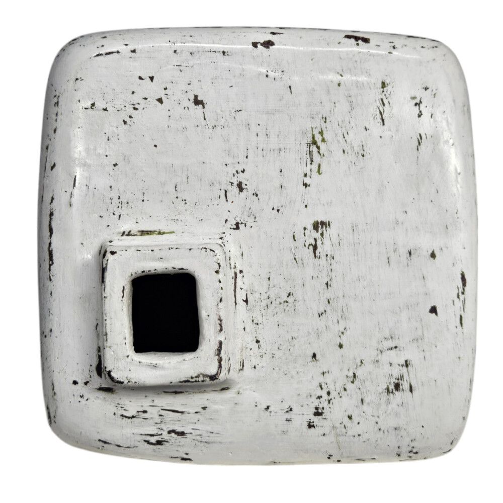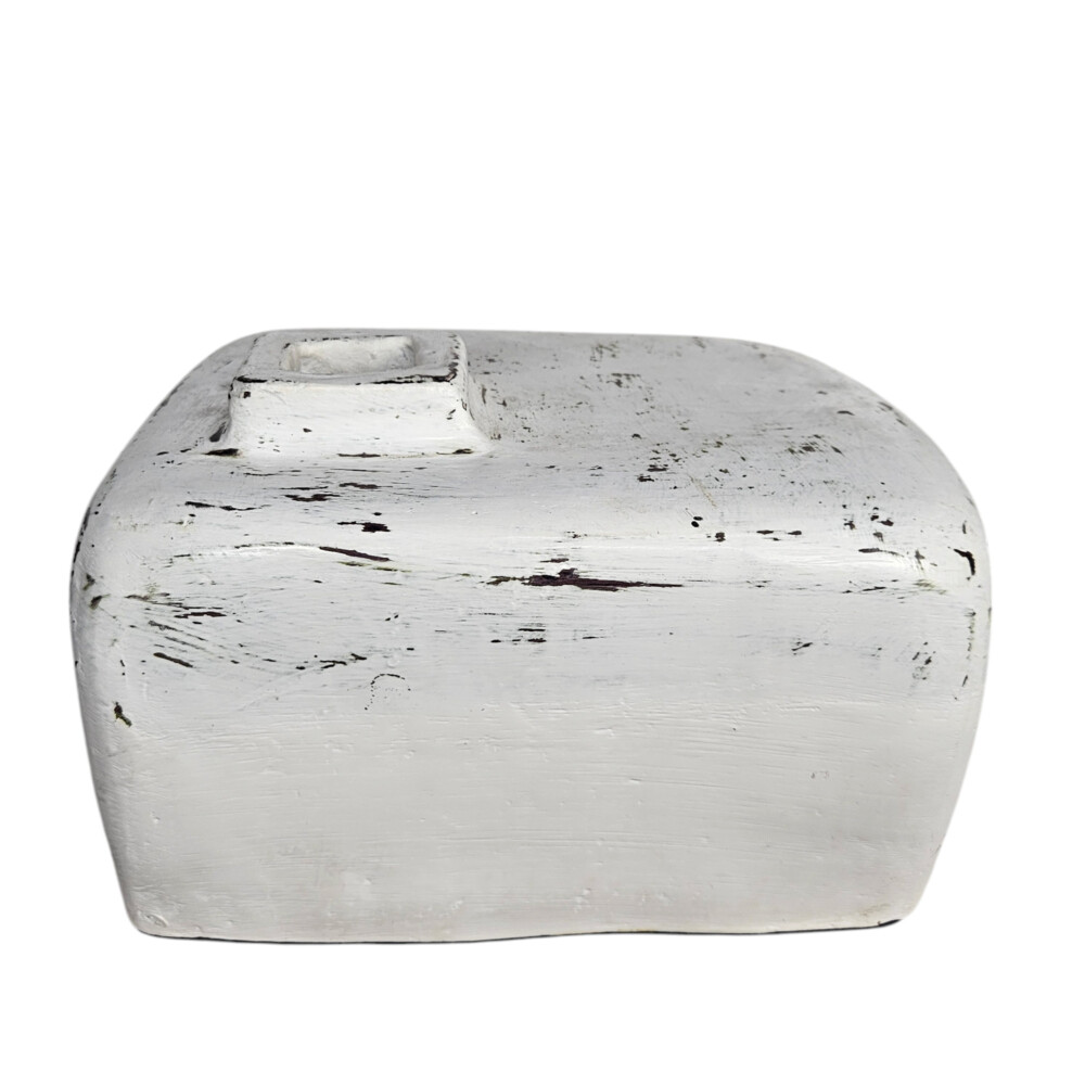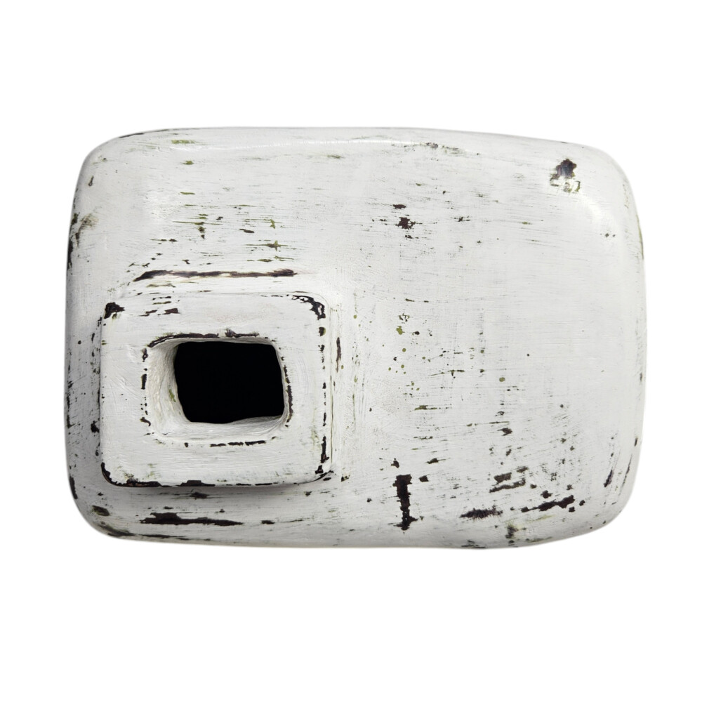 This rectangular vase features a distressed white finish that highlights its rustic character and natural texture