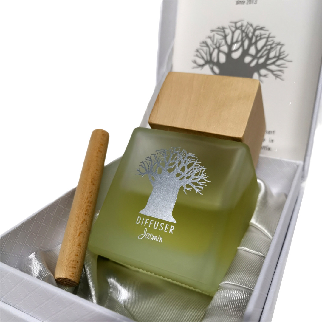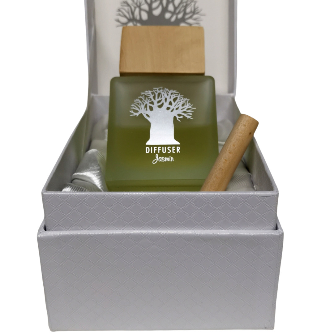 This Wooden Top Diffuser is elegantly packaged in an upmarket silk-lined white presentation box.