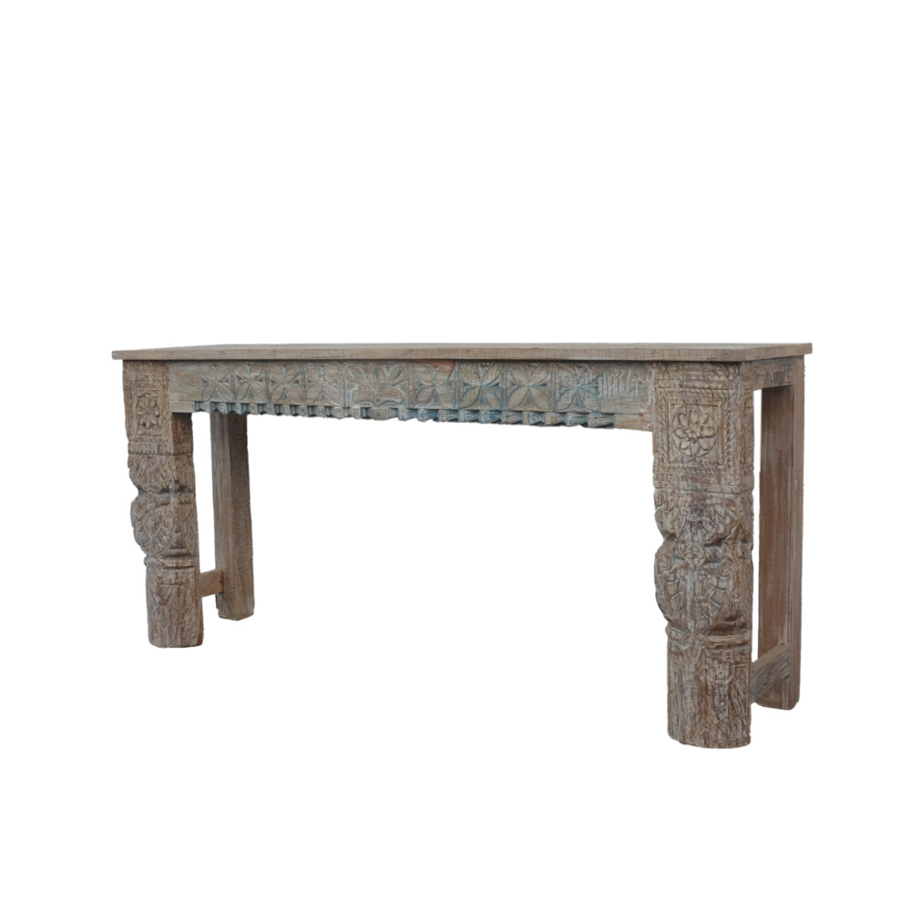 Made from solid mango wood, this 143cm (L) x 41cm (W) x 76cm (H) table features exquisitely hand-carved floral and geometric patterns along the apron and legs, creating a striking visual appeal