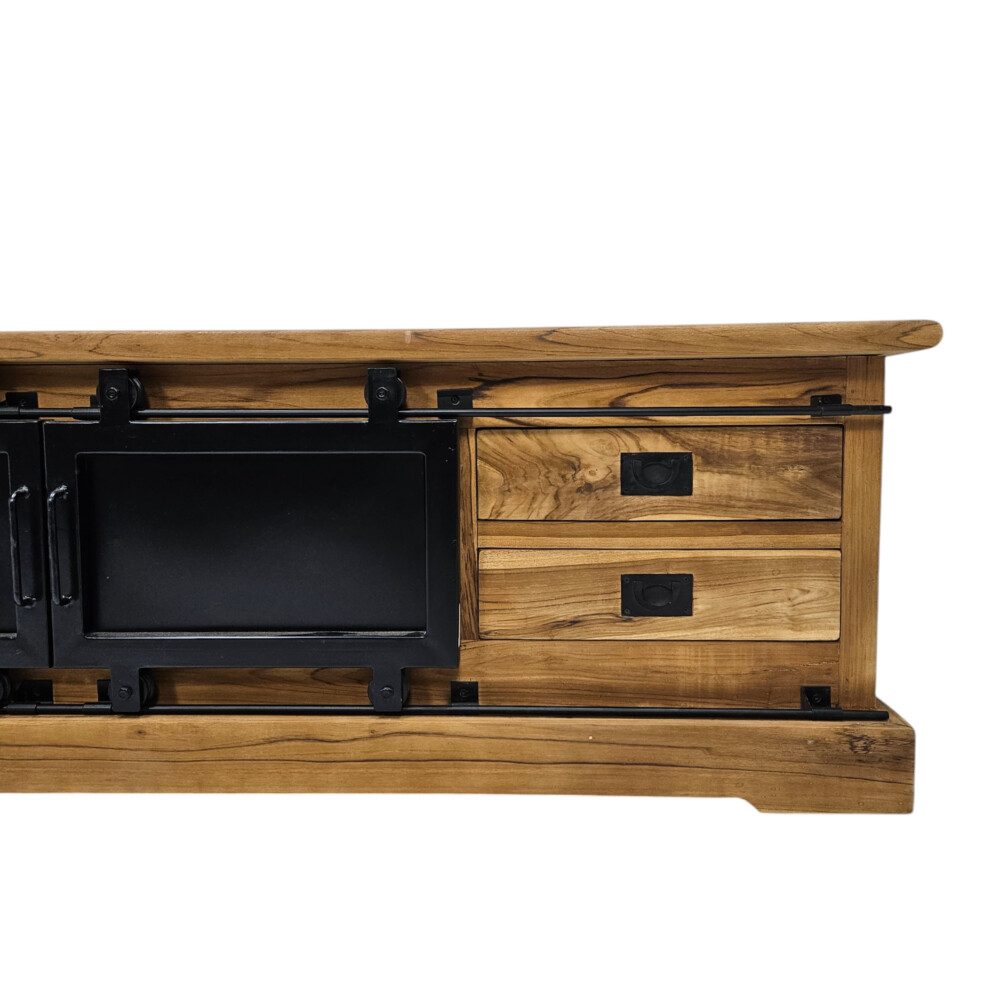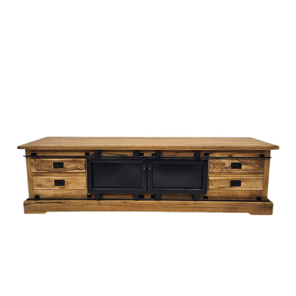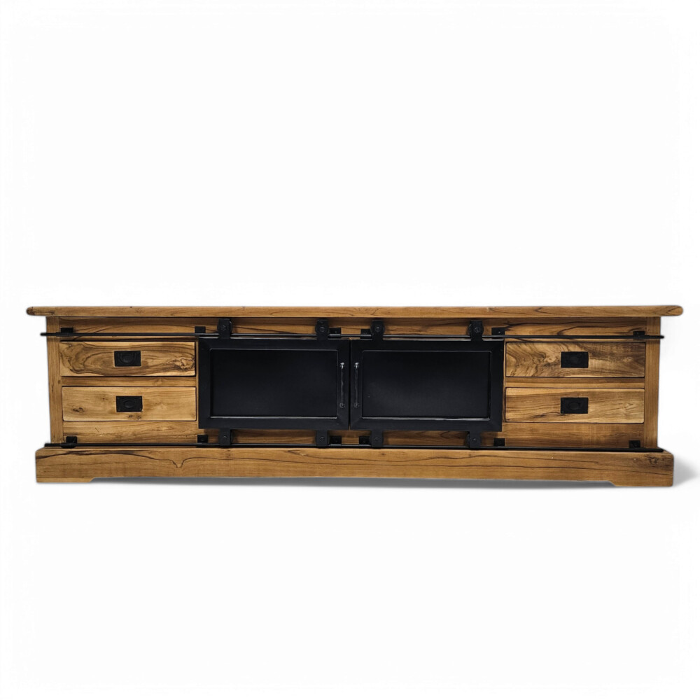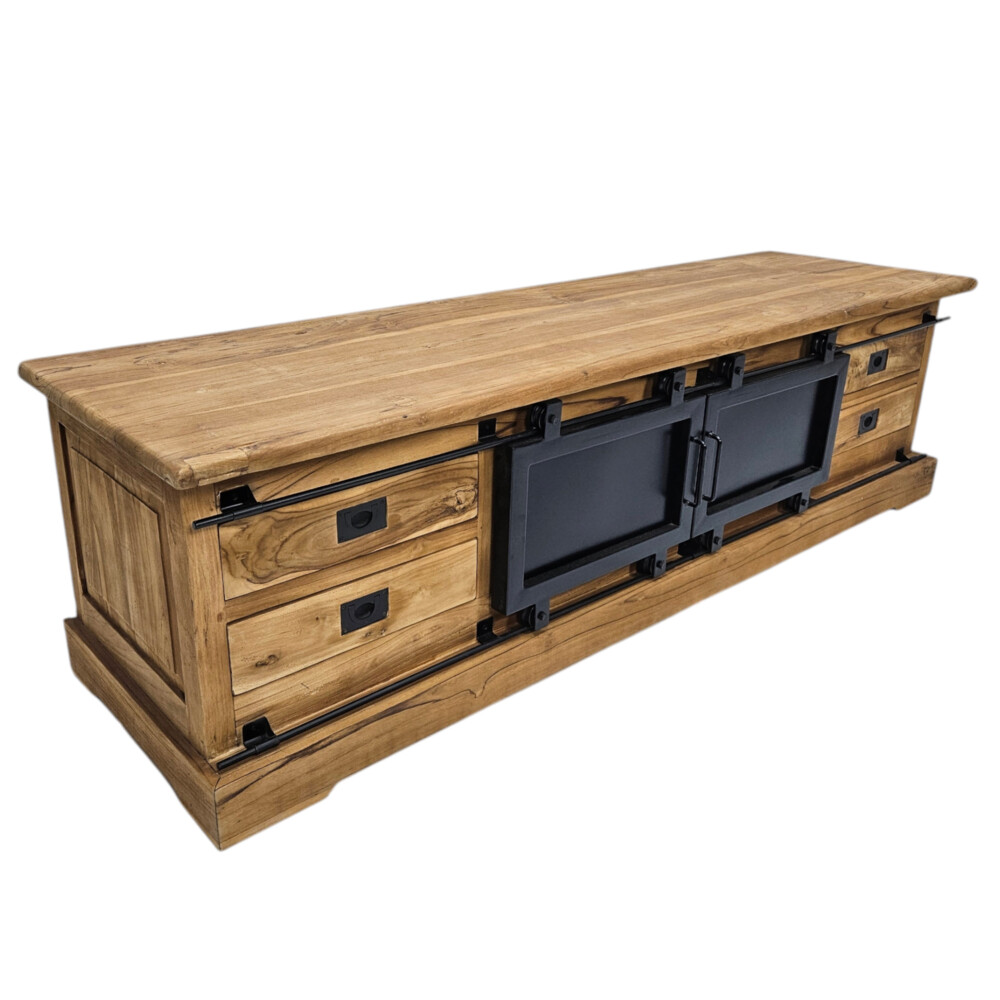 The Silo Teak TV/Plasma Unit is a bold statement piece that seamlessly blends industrial design with rustic charm