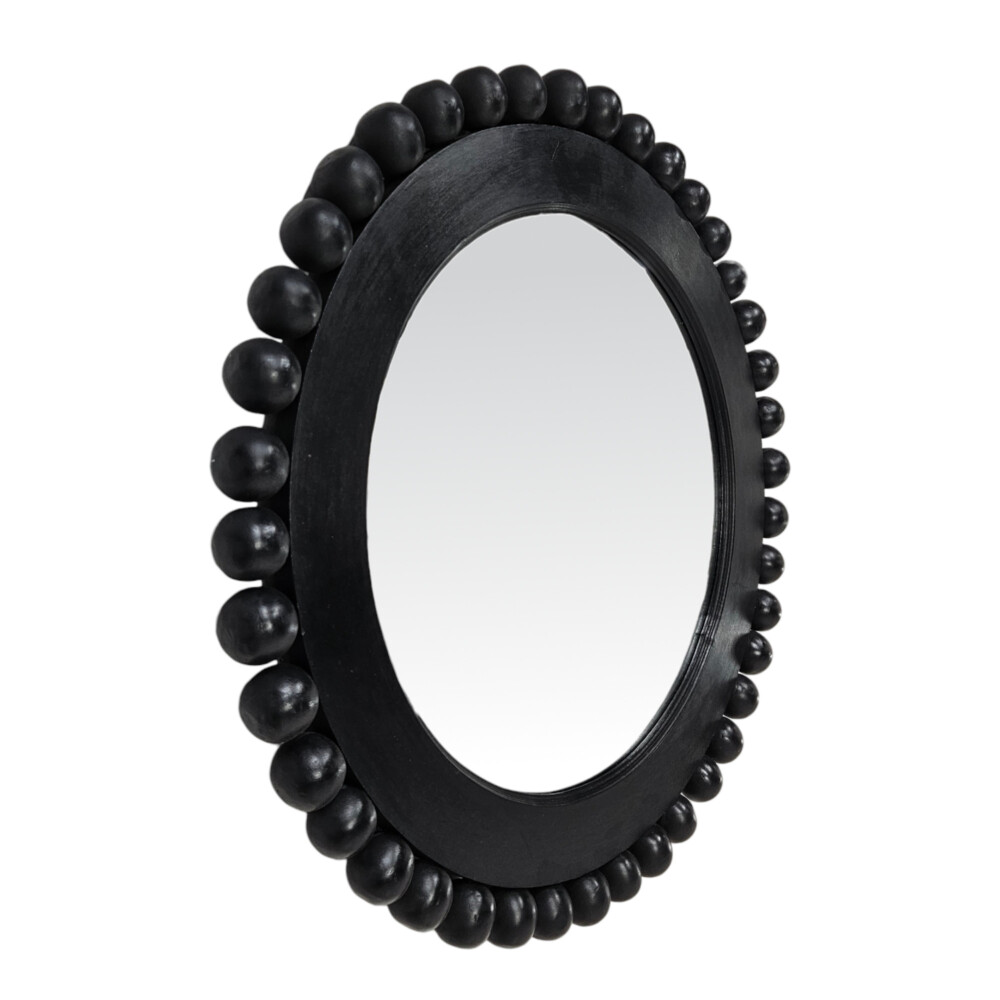 Measuring 100 cm in diameter, this mirror features a beautifully crafted wooden frame adorned with unique, rounded accents, adding depth and texture to its bold circular shape