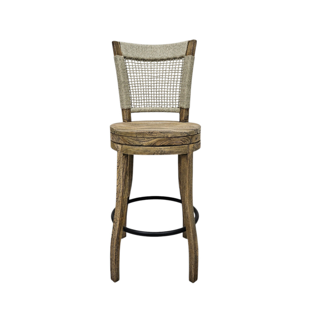 Bring rustic modern style to your space with the Teak and Rope Swivel Bar Chair
