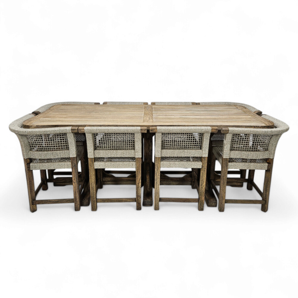 The chairs feature elegant rope detailing that not only adds a tactile and visual dimension but also offers comfortable, breathable seating. The intricately woven rope backrests are designed to complement the warm tones of the teak, creating a sophisticated yet relaxed look that’s perfect for both indoor and outdoor dining