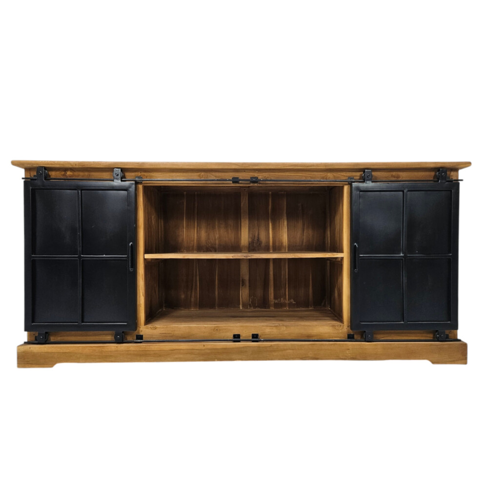 Crafted from sustainably sourced teak, this 200cm (L) x 50cm (W) x 90cm (H) sideboard showcases a stunning natural wood grain, complemented by black metal sliding barn doors that add a distinctive industrial touch