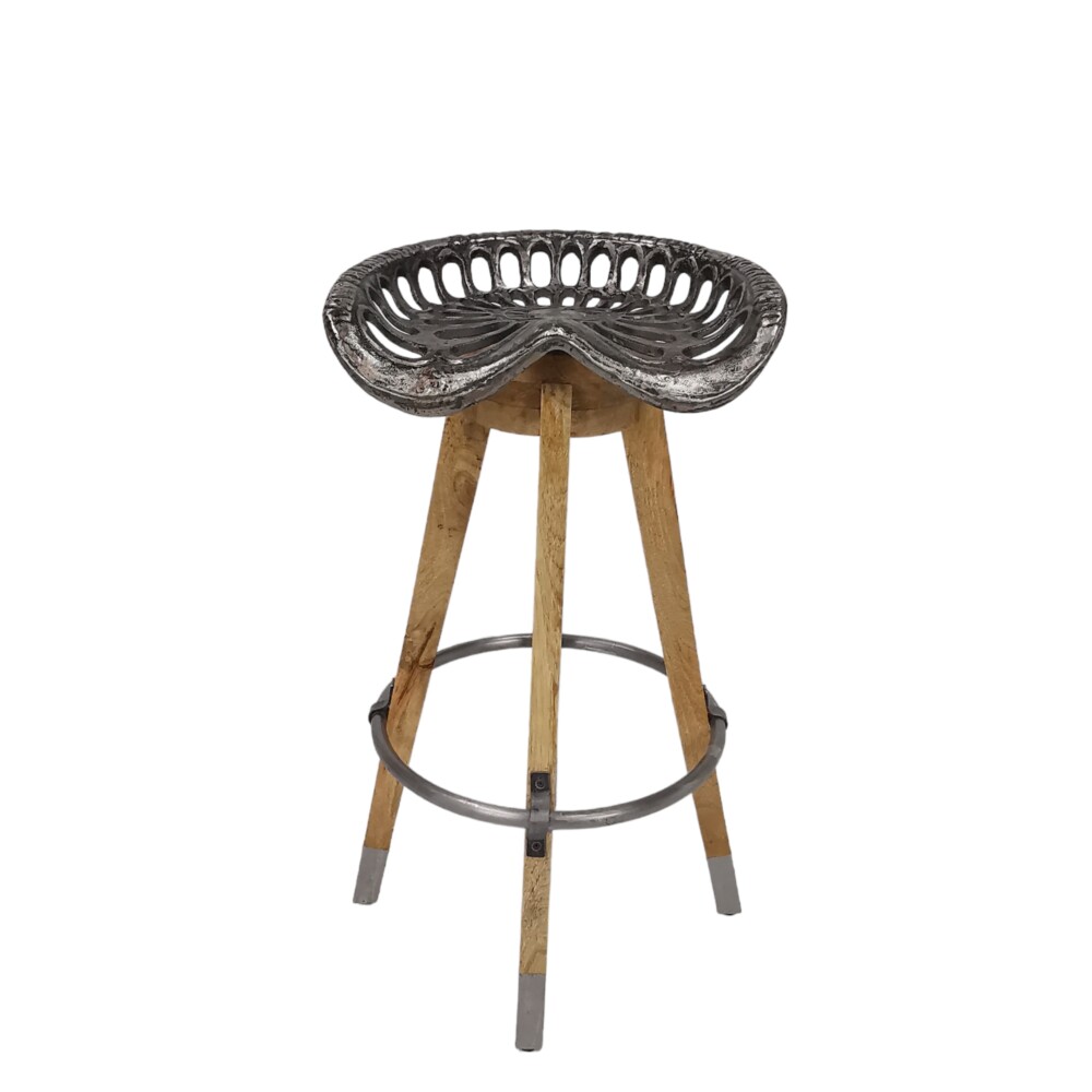 The reproposed tractor seat transformed into a bar stool painted silver exudes a rustic and industrial charm that is sure to catch the eye of anyone who sees it