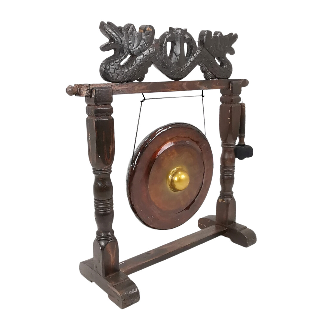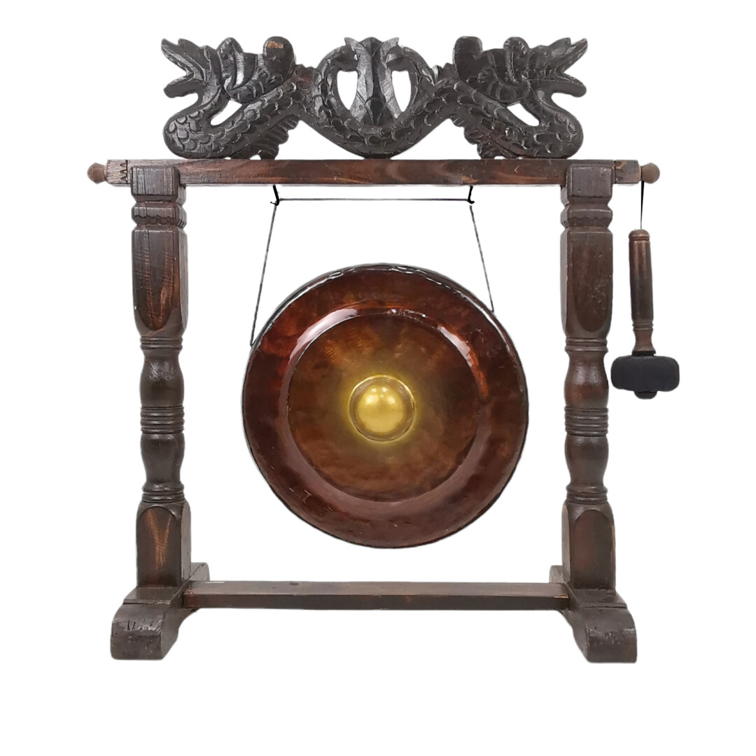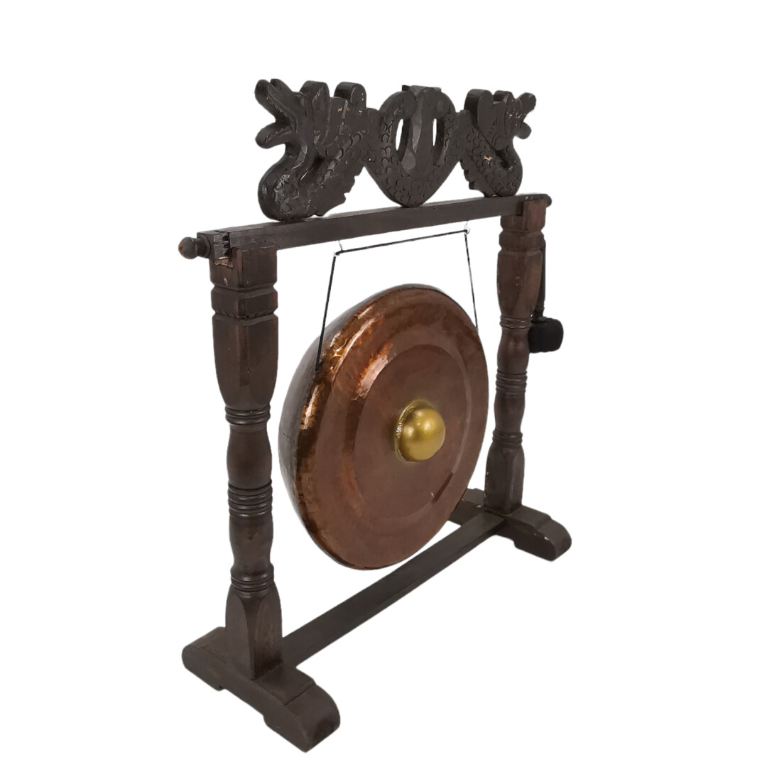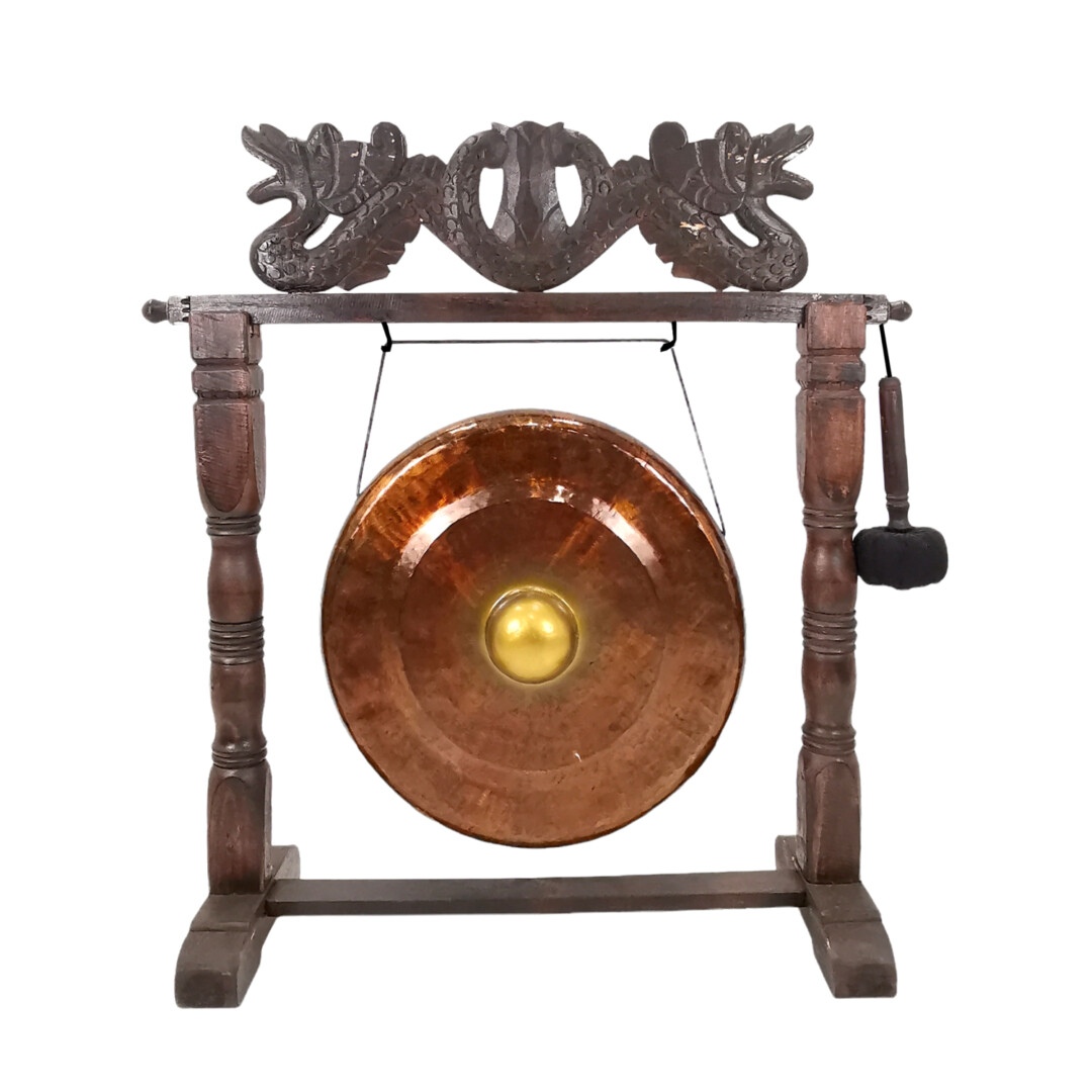 The warm richness of deep wood coloring beautifully enhances the copper metal gong’s traditional charm while contributing to a cohesive design in any setting.
