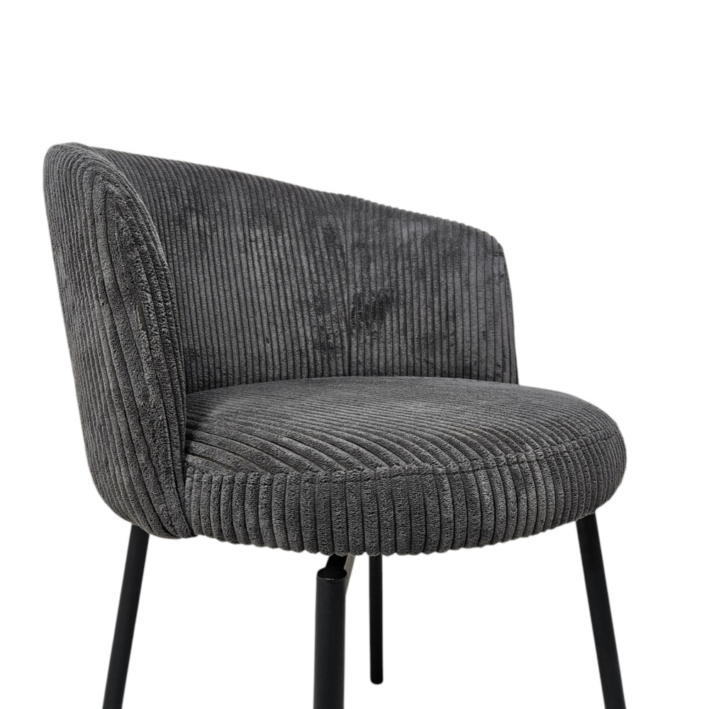 Measuring 58cm (L) x 57cm (W) x 75cm (H), this chair is crafted from high-quality polyester fabric with a ribbed texture that adds depth and sophistication