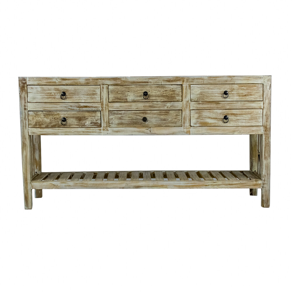 Handcrafted with care, the Afton Console features a distinctive white wash finish that enhances the teak wood’s grain, adding a rustic charm to any room it graces. Its design includes six individual drawers, seamlessly blending style with practicality in your bedroom or living space.